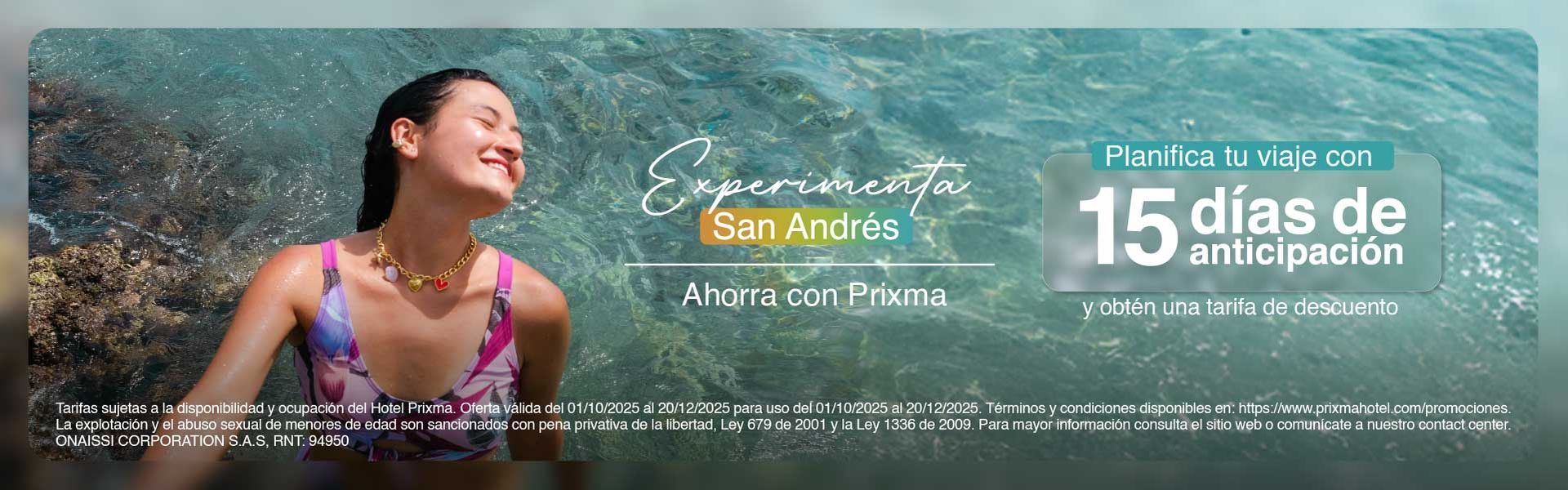 Déjate envolver por el azul infinito del mar de los siete colores. San Andrés Islas te espera con playas de arena blanca, sabores caribeños y una cultura vibrante en cada rincón. Vive este paraíso desde Hotel Prixma.